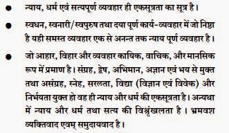 That which becomes evident in habits of food, lifestyle and behaviour, is devoid of hoarding, repugnance, conceit, ignorance and fear, and is with un-hoarding, affection, simplicity, learning (wisdom and science) and fearlessness – that (status of humankind) alone is Universality in Justice, Religion and Truth. Otherwise there is noncoherence in Justice, Religion and Truth. Individualism and Communalism are due to Illusion.